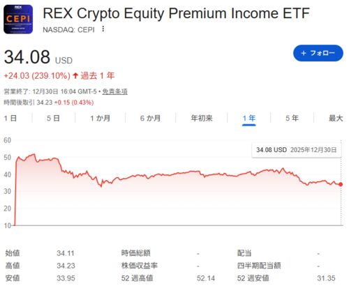 当ブログをご訪問頂きまして大変有り難うございます。 出遅れおじさんです。 二日続きのRexカバコETFネタで恐縮です。 年末押し迫って分配金をよこす迷惑な・・・もとい、年末にもかかわらず有り難い銘柄、REXシェアーズ クリプトエクイティプレミアムインカ…