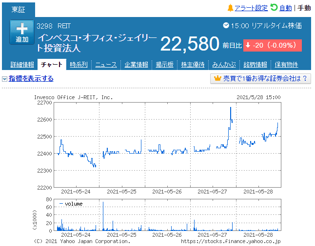 結局、その後の投資口価格はインベスコリアルエステートが提示した22,500円に近いところで膠着して、尚且つ時々上まわっています。