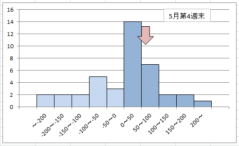 私の株式資産(日米株式、REIT等含む)の月次騰落(対前月末)分布に5月第4週末までを当てはめると、プラス側の二番めのあたりまできました。